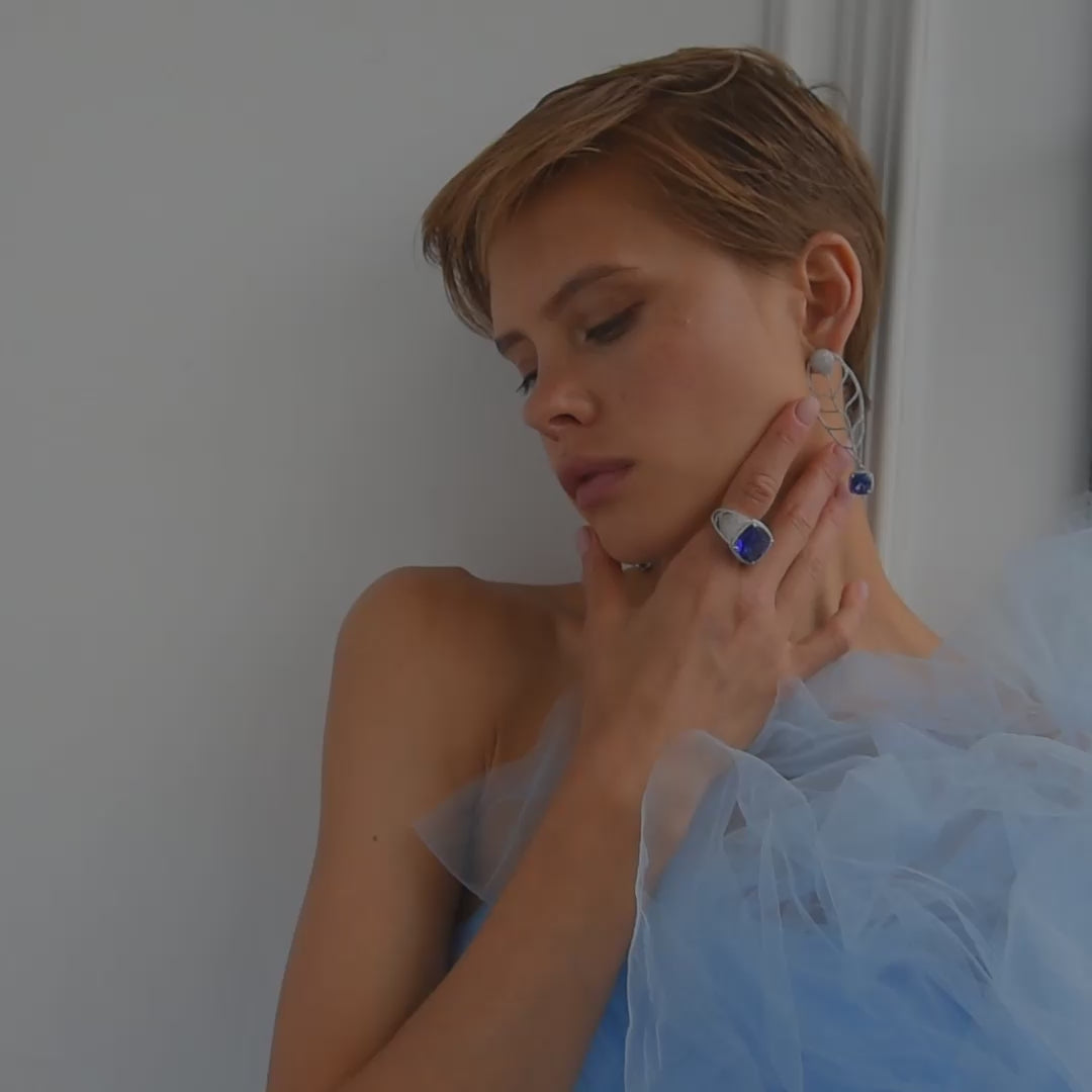 أقراط من الذهب الأبيض مرصعة بالتنزانيت والماس. لونها الأزرق الغني بلمسة بنفسجية، يضفي عليها فخامة آسرة. بتلاتها الرقيقة مزينة بألماس متلألئ.