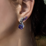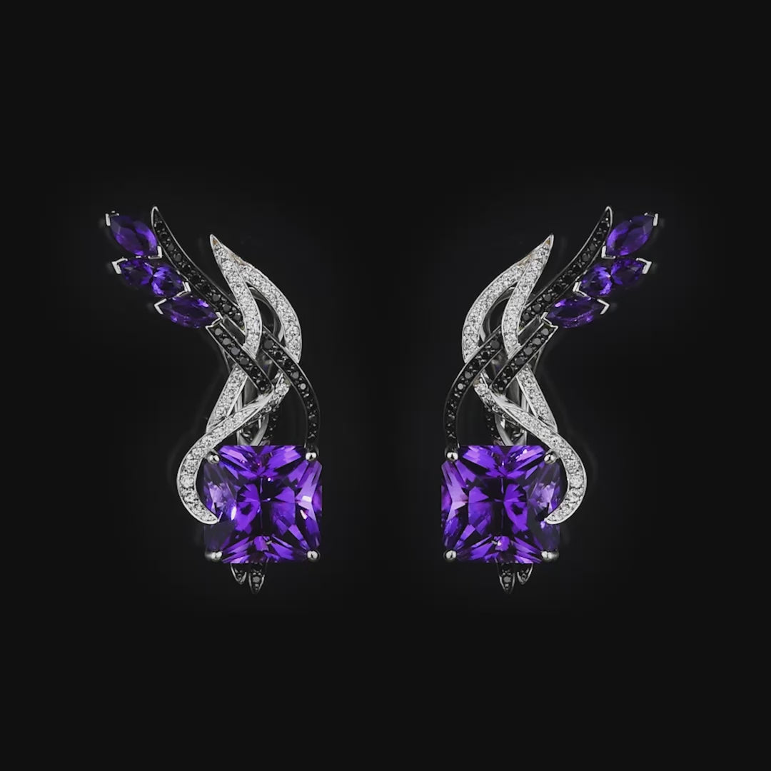 أقراط من الذهب الأبيض والأسود، مرصعة بأحجار الجمشت ومزيج من الماس الأبيض والأسود. مستوحاة من صورة ظلية الأجنحة المرتفعة، تجسد هذه الأقراط قوة راقية ورشاقة طبيعية، لتكون بمثابة تذكير بجمال ارتقاء المرأة عندما تتبع إيقاعها الحقيقي.