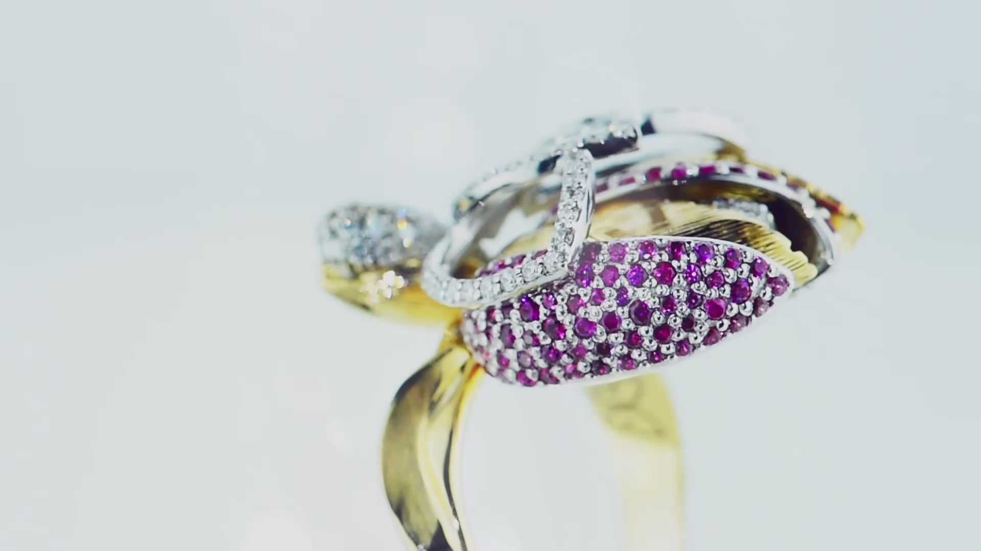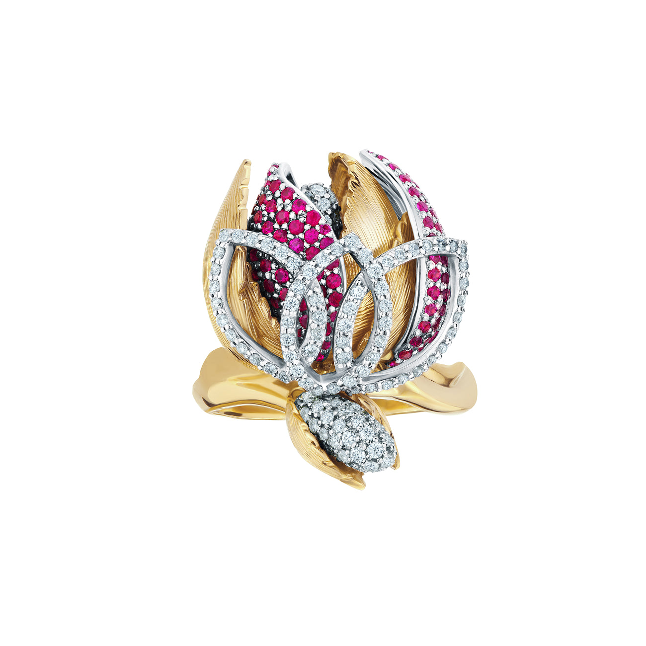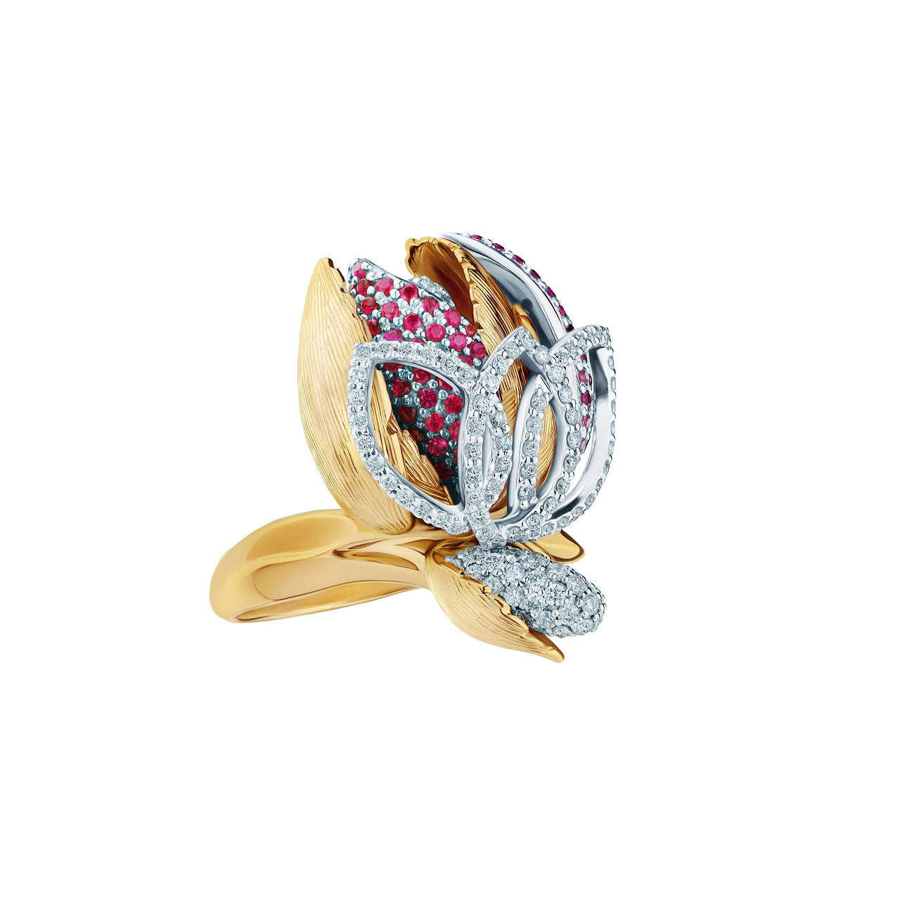 خاتم مستوحى من زهرة التوليب مصنوع من الذهب الأبيض والوردي، ومزين بالياقوت الوردي والماس.