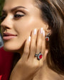 خاتم التورمالين الأحمر من مجوهرات سانخارا. اكتشف جوهر الأناقة مع هذا الخاتم الرائع المصنوع من الذهب الأبيض، والمزين بالتورمالين الأحمر المتوهج وتناغم رقيق بين الماس الأسود والأبيض.